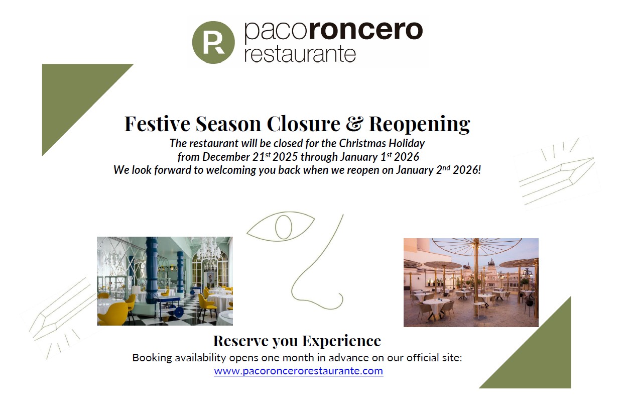 At a peak moment of creative maturity, Paco Roncero offers a cuisine that—like Madrid—is a conversation between past and present. It draws on roots and memories, yet embraces innovation and the vibrant pulse of the city. Because Madrid doesn’t cook itself. Madrid is created with those who live it. In this restaurant, you’ll discover all the Madrids that exist: the eternal, the emerging, and the one each diner carries within.